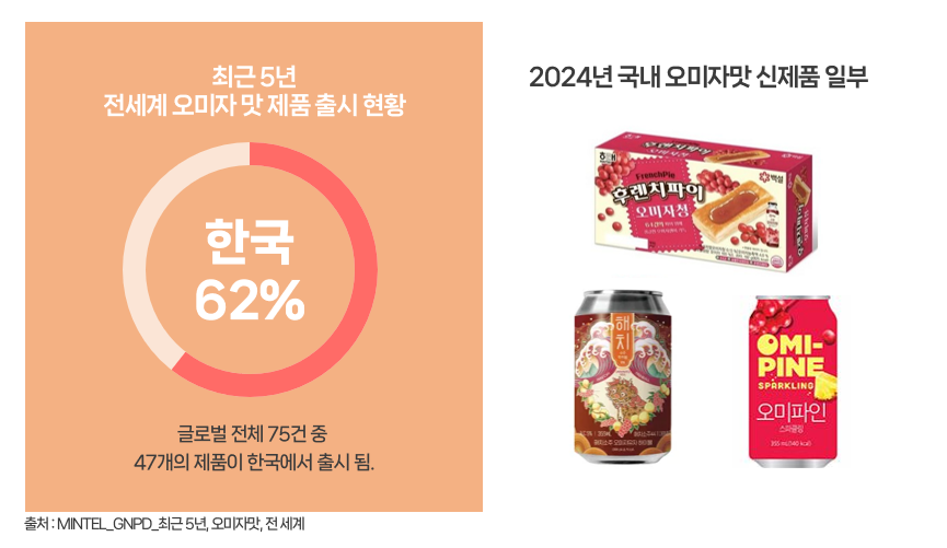 오미자, 우리에게는 참 익숙한 과일이지만, 전 세계적으로는 한국에서만 사랑받고 있다는 사실을 알고 계셨나요? 글로벌 조사기관 민텔(Mintel)에 따르면 최근 5년간 출시된 오미자 제품 중 62% 이상이 한국에서 출시되었다고 합니다. 이러한 자료를 증명하듯 국내에서는 오미자를 제과·음료 등 다양한 제품으로 활용되고 있는데요. 2024년에 출시된 해태제과의 오미자 후렌치파이와 산뜻한 맛을 살린 RTD 음료들이 대표적입니다. 그렇다면 카페 프랜차이즈에서는 어떤 형태의 오미자로 소비자의 마음을 사로잡고 있을까요?