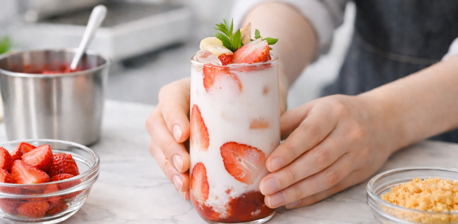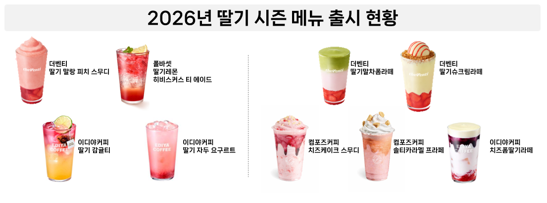 단일 딸기메뉴에서 '복합형' 딸기메뉴로 올해 딸기메뉴의 가장 큰 특징은 복합형으로의 확장입니다. 과거에는 딸기주스, 딸기 우유라떼처럼 딸기 자체에 집중한 메뉴가 주를 이뤘다면 올 시즌은 딸기를 중심으로 다른 재료를 적극적으로 더하는 방식이 눈에 띕니다.