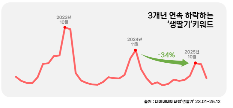 이젠 메뉴명에서 사라지는 '생딸기' 복합적인 딸기 음료의 확대는 메뉴명에서 '생딸기' 단어를 점점 사라지게 했습니다. 작년까지만 해도 생딸기를 전면에 내세우던 브랜드가 많았지만, 올해 출시 메뉴에서는 찾아보기 어렵습니다. 컴포즈와 이디야에서도 작년까지는 '생딸기' 메뉴를 다수 출시했지만, 올해는 두 곳 모두 해당 키워드를 제외했습니다. 실제로 네이버 데이터랩의 '생딸기' 키워드는 3개년 기준 하락 추세이며, 24년 11월 대비 25년 동기간에는 약 34% 하락하기도 했습니다. 딸기 메뉴 경쟁이 과열되면서 '생딸기'라는 단어 하나만으로는 더 이상 신선함을 느끼지 못하는 소비자들이 늘어나면서 자연스럽게 사라지게 된 것으로 보입니다.