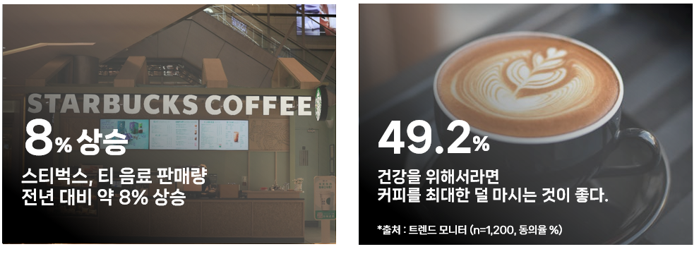 최근 티 음료에 대한 소비자 반응이 심상치 않습니다. 스타벅스에서는 지난해 티 음료 판매량이 전년 대비 8% 성장했으며, 특히 20대 소비자층에서는 20% 이상 증가했다고 밝혔습니다.