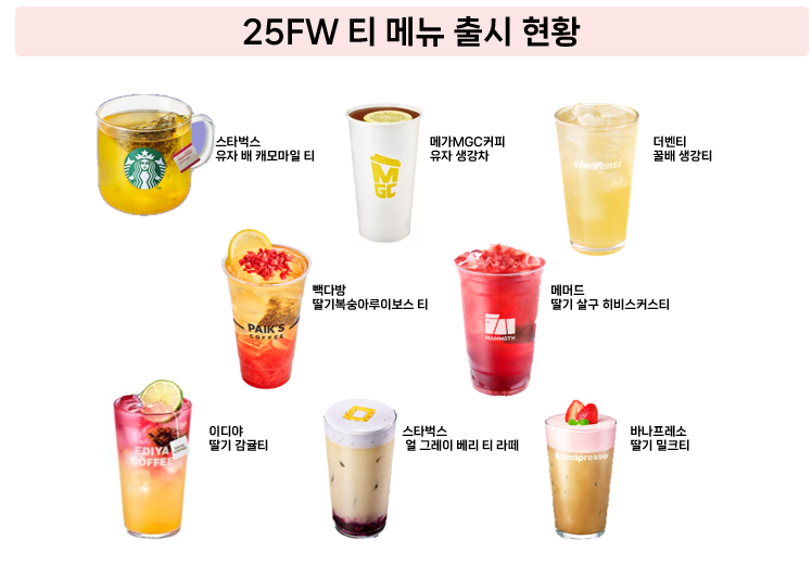 국내 소비 트렌드의 변화와 더불어 중국 티 브랜드의 영향까지 더해지며, 국내 카페 프랜차이즈 역시 전략적으로 티 음료 라인업을 강화하고 있습니다.